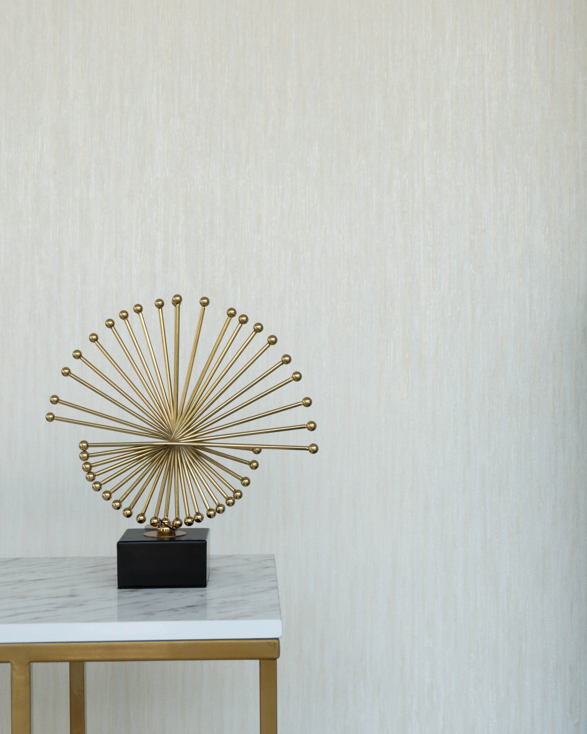 Este diseño combina la calidez del beige con un delicado efecto metalizado en tonos perla que refleja la luz de manera sutil, creando un juego visual elegante y sofisticado. Su textura en relieve aporta dinamismo y profundidad, evocando un estilo natural pero refinado.